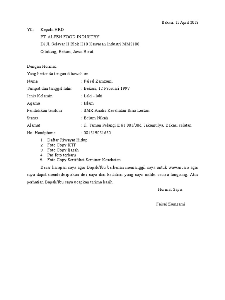 Surat Lamaran Pt Alpen Food Industry from imgv2-1-f.scribdassets.com Rekomendasi paling lengkap dan terbaru. Tuliskan juga nilai apa yang anda miliki. Berikut ini contoh surat lamaran kerja untuk divisi marketing di beberapa perusahaan besar dan menengah, kamu juga bisa mendownload filenya gratis. Panduan cara membuat surat lamaran kerja menarik. Bekerja di bumn memberikan banyak keuntungan terutama dalam masalah finansial. Contoh surat lamaran kerja di pt sebagai karyawan. Surat lamaran kerja adalah surat yang digunakan sebagai legalitas untuk mengajukan permohonan mendapatkan pekerjaan pada perusahaan yang dituju. Surat lamaran kerja merupakan salah satu hal pokok yang sangat penting bagi kita yang sedang mencari pekerjaan dan akan melamar kerja di suatu selain surat lamaran kerja kamu juga harus mempersiapkan surat daftar riwayat hidup.